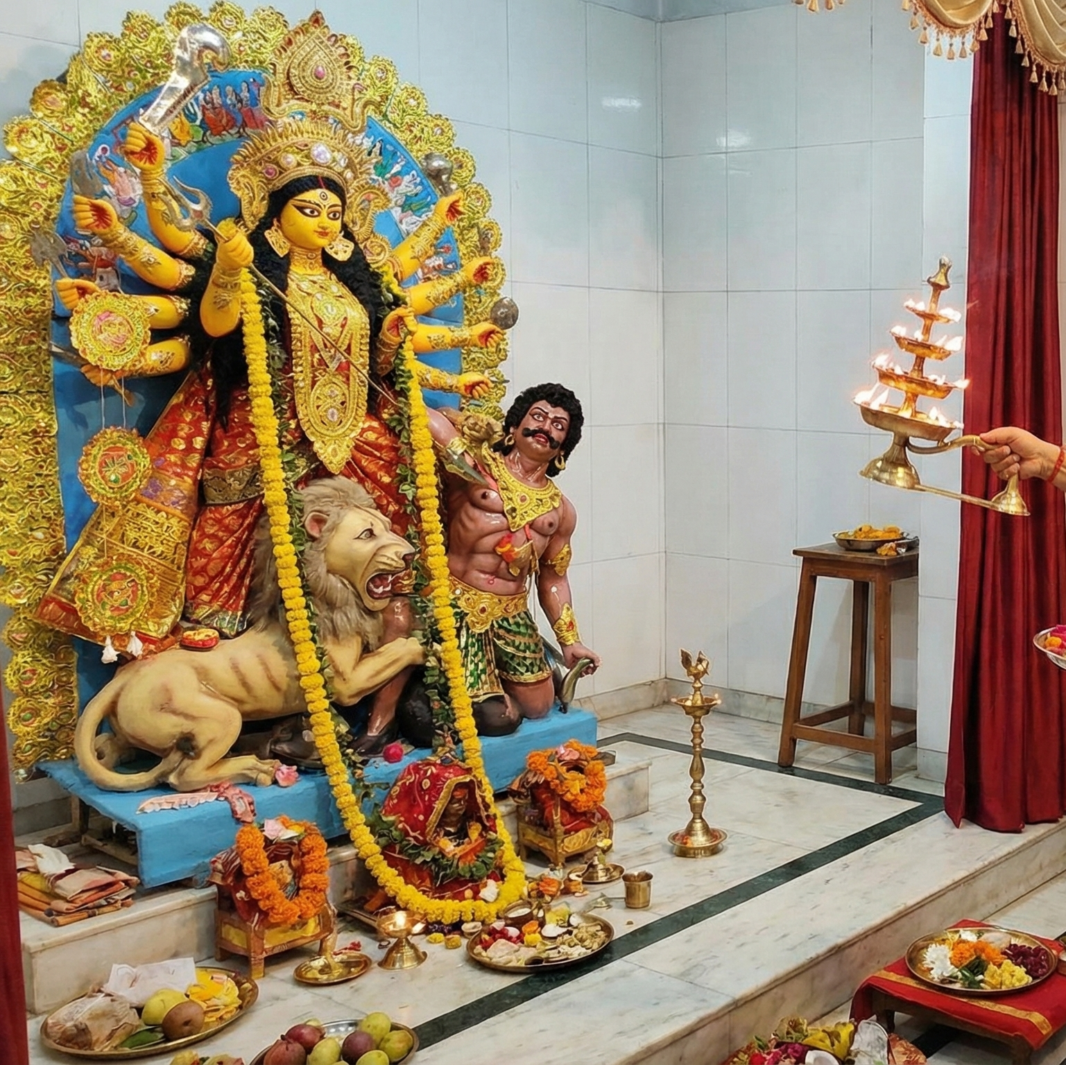 Based on the Devi Mahatmya, describing the battle where Durga kills the buffalo demon Mahishasura.