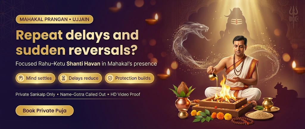 A private Shanti in the Mahakaleshwar Jyotirling Prangan • A private, focused Shanti inside Mahakaleshwar Jyotirling Prangan to reduce repeat blocks, restore inner steadiness, and help results come on time. A Kala Sarp Shanti Puja + Vedic…
